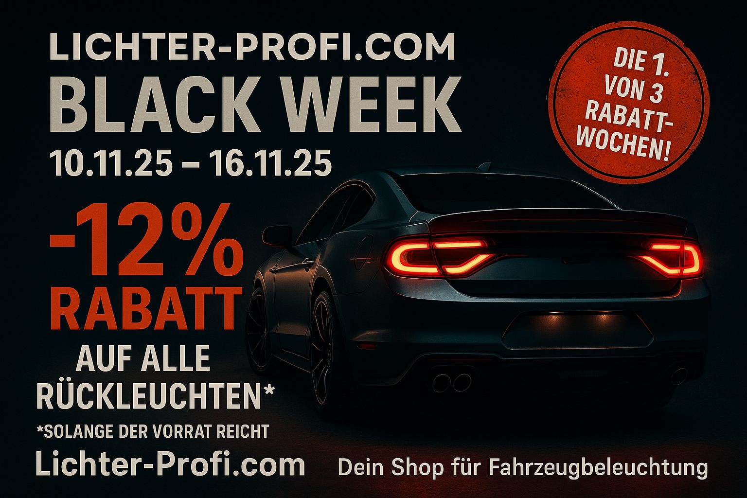 Zum Start der Black Weeks bekommt ihr 12 % Rabatt auf unser komplettes Sortiment an Rückleuchten – von PKW über Transporter bis hin zu Nutzfahrzeugen.