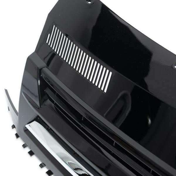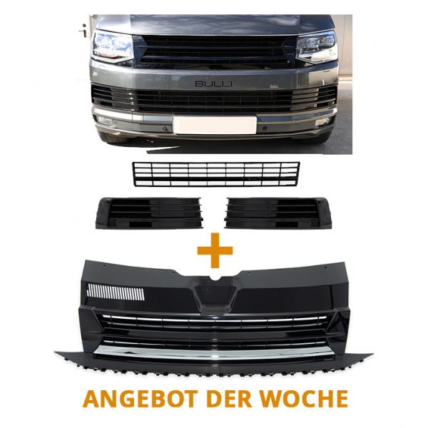 Paket-Upgrade Design Kühlergrill schwarz mit Chromleiste ohne Emblemhalter + Set Gitter Grill Einsatz Stoßstange vorne unten Hochglanz Schwarz für Volkswagen T6 15-19 Hochglanz