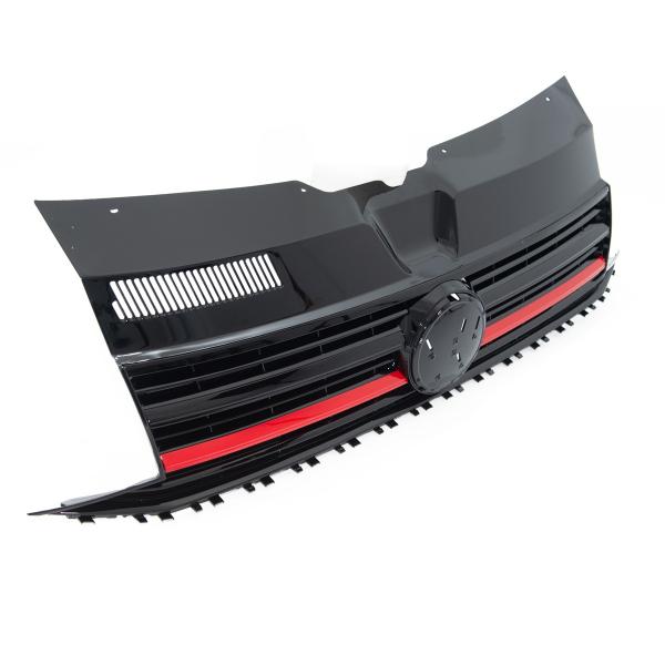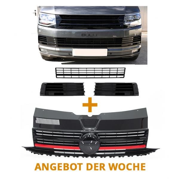 Paket-Upgrade Design Kühlergrill schwarz mit roter Leiste und Emblemhalter + Set Gitter Grill Einsatz Stoßstange vorne unten Hochglanz Schwarz für Volkswagen T6 15-19 Hochglanz