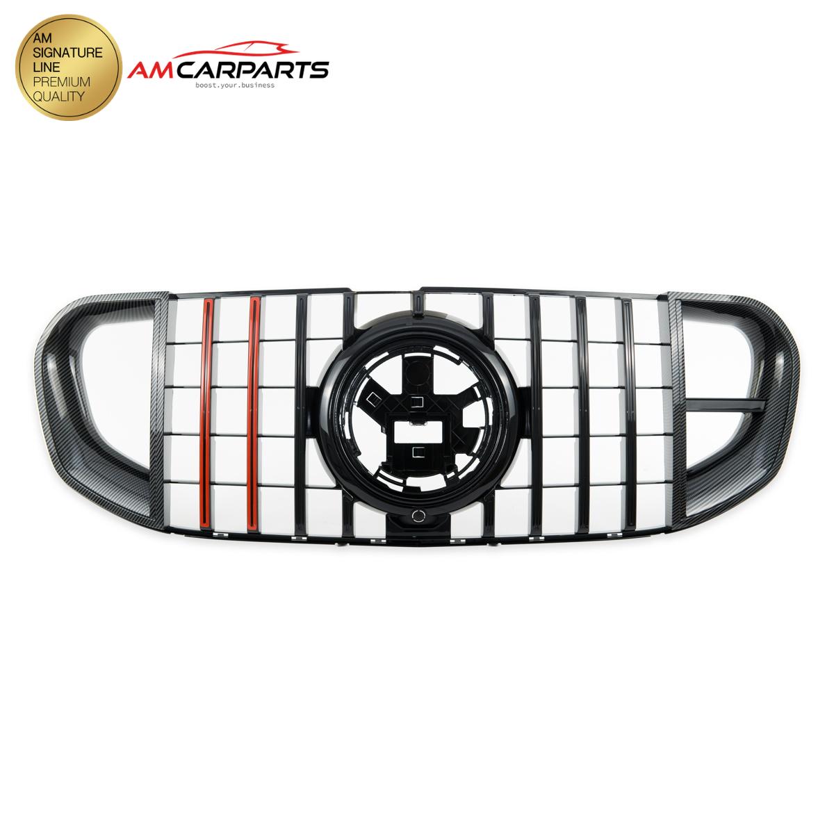 Upgrade Design Kühlergrill / Sportgrill für Mercedes Benz GLS (X167) 18+ Carbon-Optik / Hochglanz schwarz + rote Akzentstreifen